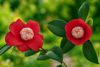 Buschig aufrechter, kompakter, reich blühender Strauch oder kleiner Baum. Blätter bis 8 cm lang, breit eiförmig, glänzend dunkelgrün. Blüten dunkelrot, silbrig überhaucht, rosenförmig bis vollständig gefüllt, schwärzlich gefärbter Spitze. Winterhärtezone 8