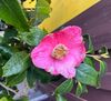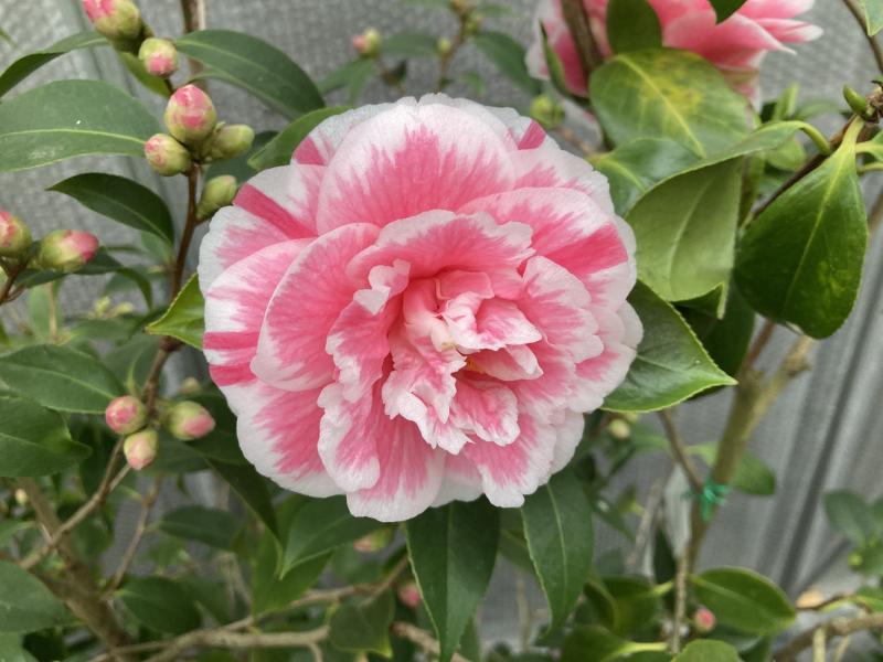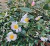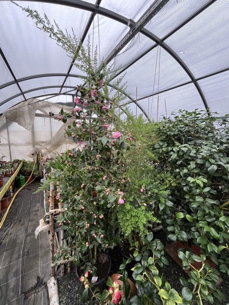 Die Bokuhan ist eine besondere Kamelienart, und es ist spannend, dass sie dieses Jahr einen Austrieb und eine spezielle weiße Blüte entwickelt hat. Die Bokuhan habe ich 2016 gekauft. Wenn sich der Austrieb unter der Veredelungsstelle befindet, könnte es sich möglicherweise um einen Trieb der Unterlage handeln – das ist interessant zu beobachten, um zu sehen, wie er sich weiter entwickelt.