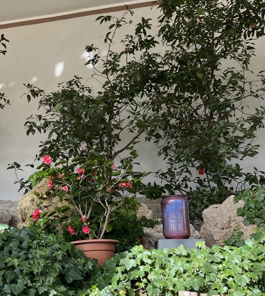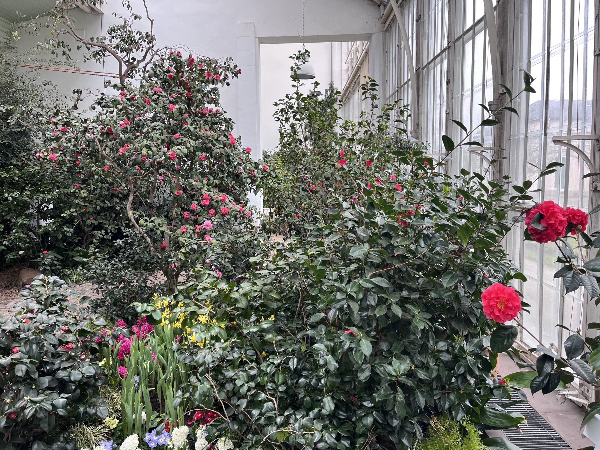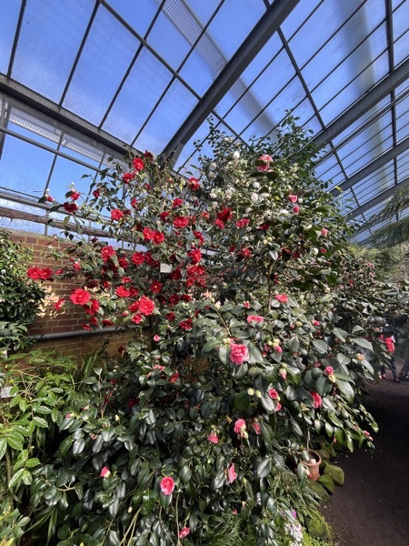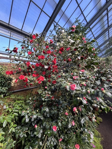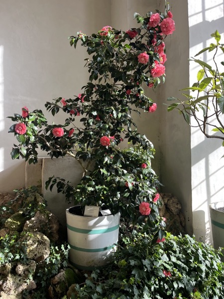 Im Moment blühen die drei großen, bis über 200 Jahre alten Kamelien, das Gros der denkmalgeschützten Kamelien wird in den nächsten Wochen seine Blütenpracht entfalten.