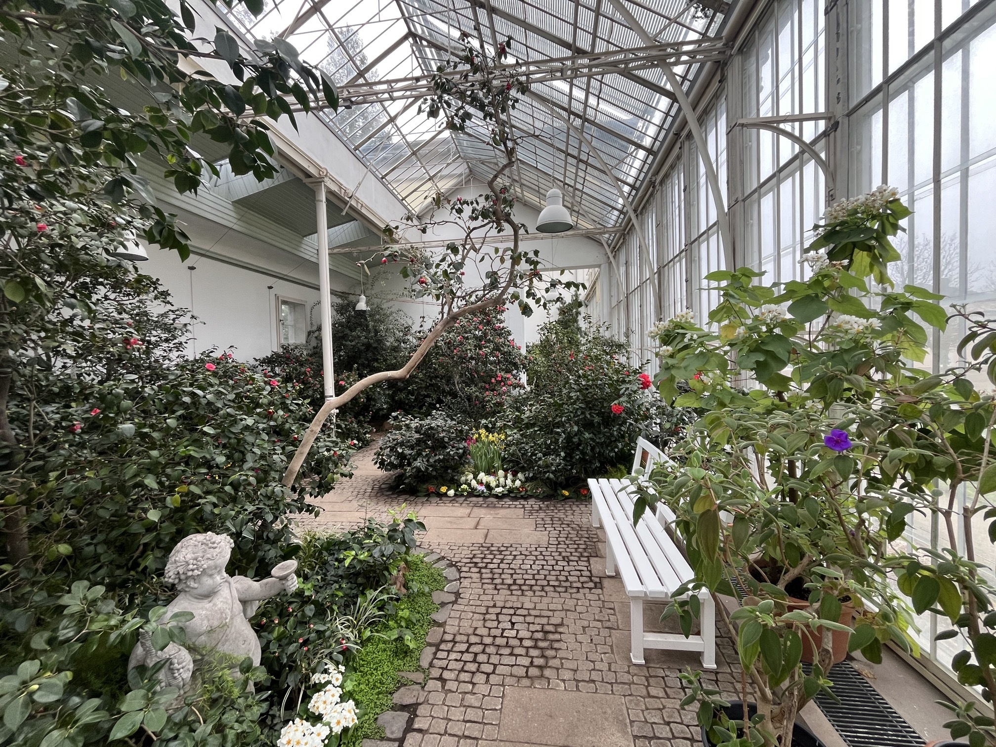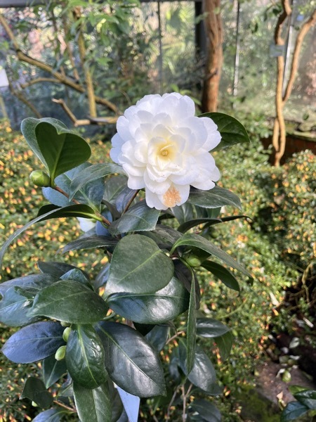 Besonderheit: Die Sorte „Alba Plena“, eine der ältesten Kamelien Europas nördlich der Alpen, blüht dort in beeindruckender Pracht.