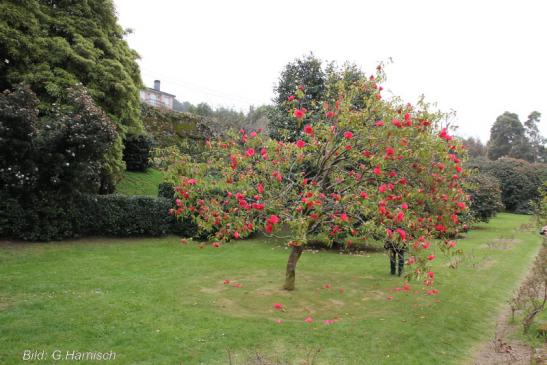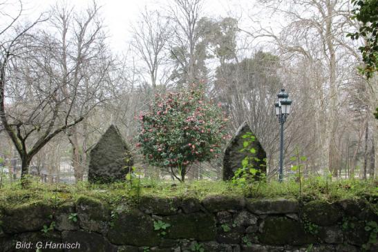 Sollte der Reisende auf die glückliche Idee gekommen sein, den Pazo mitten im Winter zu besuchen, wird sein Blick unweigerlich von den betörenden Farben der Kamelien eingefangen. Pazo-Museo Quiñones de León Pazo-Museo Quiñones de León Es ist nur eine Illusion, aber eine wahre: Ab Ende Februar führen die Kamelien vom Pazo Quiñones de León eine botanische Großtat nach der anderen aus. Wie zum Beispiel, zur gleichen Zeit zwei verschiedenfarbige Blüten am gleichen Baum hervorzubringen. Dies ist der Fall bei der Methusalem-Kamelie, die dieses Kunststück über denselben Buchsbaumbüschen des französischen Gartens hängend mindestens seit 1860 vollbringt. Aber auch die Kamelien des englischen Gartens, dem Rosengarten, oder jene, die wie chinesische Laternen eine beunruhigende Blätterhöhle erleuchten, bringen Tag für Tag ihr Wunder zustande und lassen die Augen ihrer Besitzer vor Stolz aufleuchten, Ihren Augen, liebe Besucher, die Sie durch das Anwesen des Pazos schlendern.