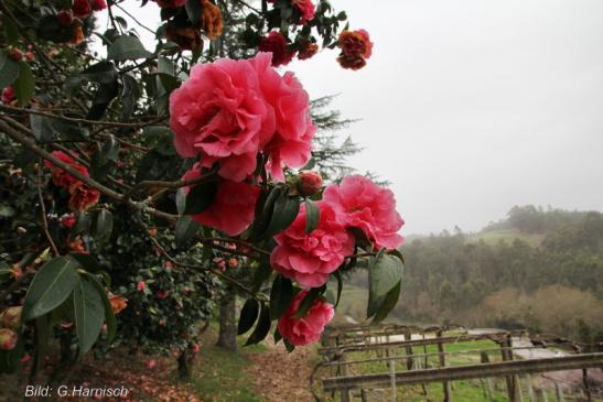 Soutomaior war einst von Pedro Madruga bewohnt, jener Feudalherr, der eine Vorliebe für den Galgen und das Messer hatte und in der Lage war, den Bischof Don Diego de Muros in einen Käfig zu stecken und ihn so durch den gesamtem Landkreis zu fahren, zum Spott natürlich. Zu jener Zeit gab es in Soutomaior keine Kamelien, jedoch mit Sicherheit Kastanien. Und bestimmt auch einige Weinberge. Castelo de Soutomaior Viel später kamen die Orangen- und Eukalyptusbäume und Palmen hinzu. Und natürlich die Kamelien. Kamelien, die zuerst in kleinen Gruppen über den Park verteilt wurden und sich später wie farbige Girlanden um den Hügel schlangen. Weiße, makellose Kamelien, wie Sahnetörtchen in einem Korb. Große, offene, wie Dahlien. Gelbe, rote ... Und natürlich rosafarbene in allen Tönen und Größen. Rosa ist auch, in diesem Falle rosé, die unvermeidliche Farbe, die die Kamelien annehmen, wenn sie sterben. Ihre goldenen, fast ockerfarbenen Blütenblätter werden teppichartig in komplizierten Arabesken in den Straßen vieler galicischer Städte für die Prozessionen des Viatikums oder zu Fronleichnam angeordnet. Vielleicht zur Wiedergutmachung.